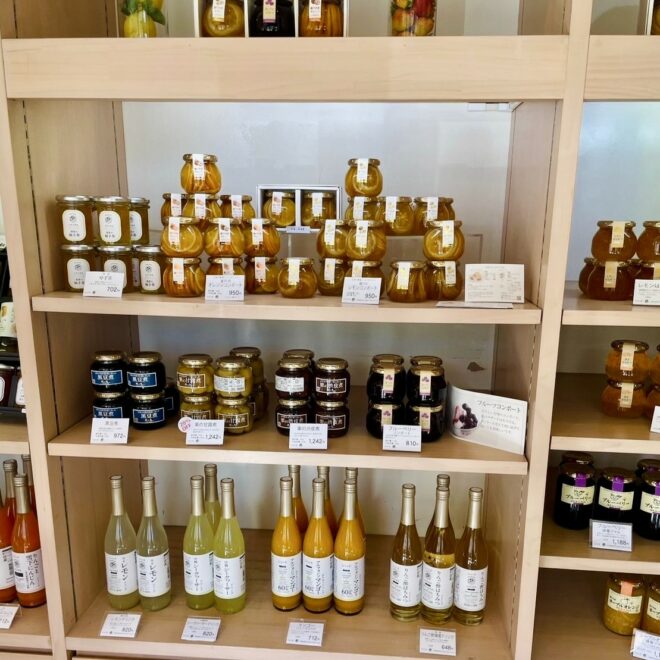 はなのみさんのお店には美しいジャムやジュース、コンポート、はちみつが並んでいてまるで夢のような光景でした。