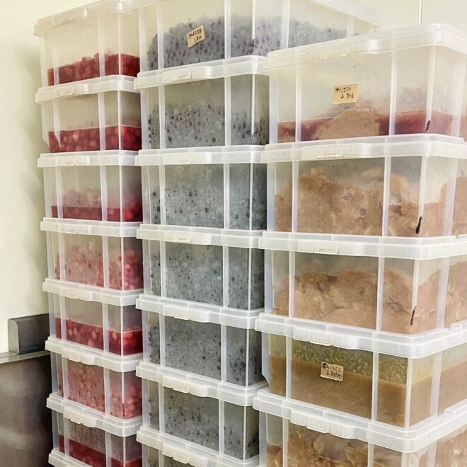 長野県産のフルーツをメインに、全国から取り寄せたフルーツがジャムにされるのを待っています。はなのみのジャムは現在7割が国産フルーツのもの。