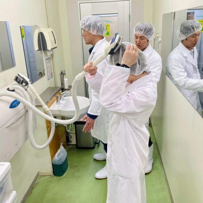 厳重な衛生管理の元でジャム作りをされているはなのみ。見学前にはしっかりとキャップまでかぶり体についたほこりなども取り去ります。