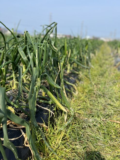 除草剤は不使用で全て人の手で雑草抜きを行う!あえて畝の下に雑草を残し、水が乾かないようにしています。