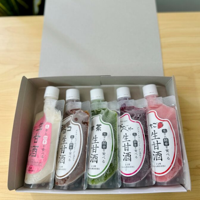 - わいん屋おおきにの生甘酒をきっかけに甘酒が飲めるようになりました。それだけでなくお腹の調子も良くなって、「腸活」とはこういうことか、と実感。できれば毎日飽きずに飲みたいので、こういうセットは良いですね。いちご味は「こんなに甘酒とフルーツって合うんだ!」と思わされました。抹茶味は抹茶自体が多分すごく良いものなのでとにかく味が美味しいし、ブルーベリー味は風味も細かい粒々の食感も好きです。生甘酒は腸活だけでなくほかの栄養も良いみたいなので頑張って続けたいです。
