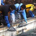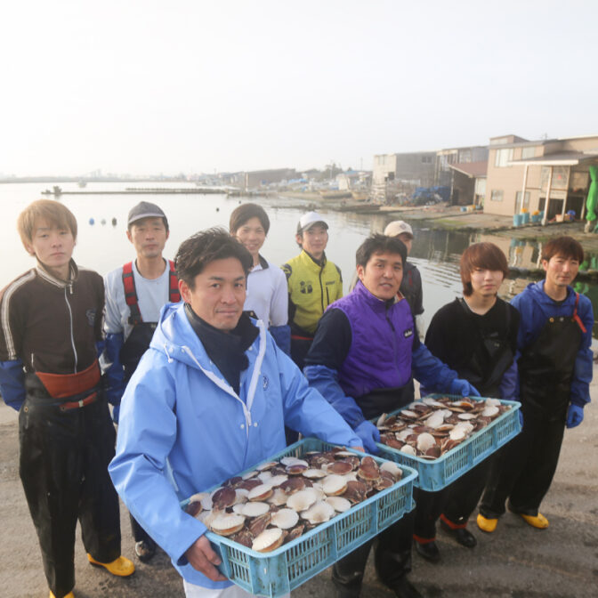 山神さんは40年以上前から陸奥湾で、ほたての養殖から加工出荷までを行っています。水揚げは全身を使うかなりの力仕事。船のヘリに脛を当ててひたすらほたての入った網を引きます。大畑もヘトヘトになった作業、創業者である先代は、1日に1人で2tも水揚げしていたそうですから驚きです。