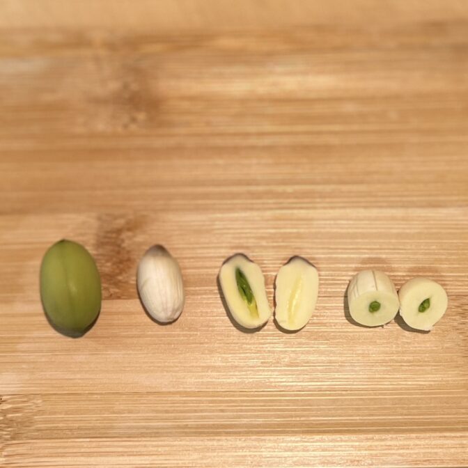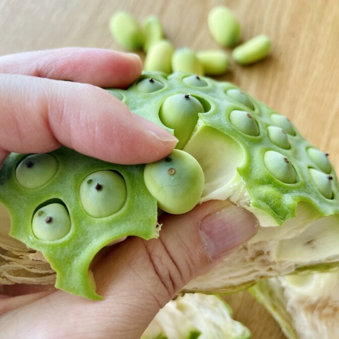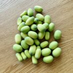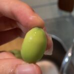 実を取り出し、軽く湯掻いて皮を剥いて食べると、ナッツのような食感で少し苦味があり、ビールのお供にも最高です。