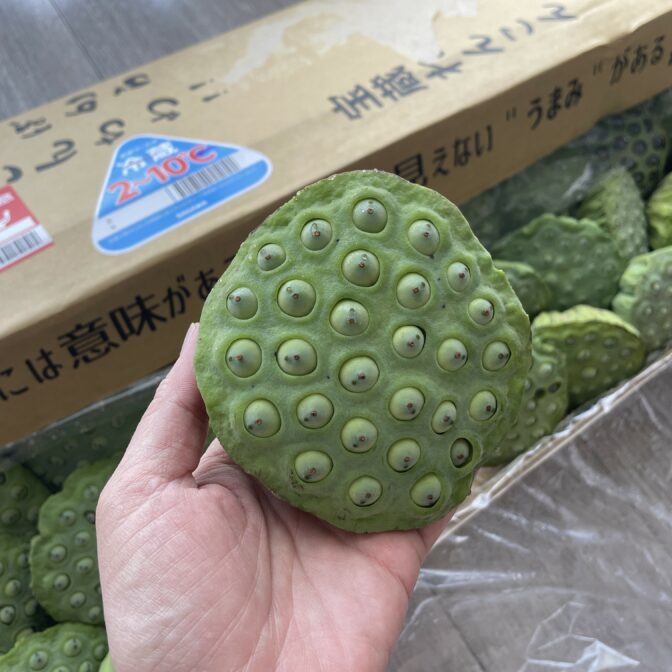 - 蓮台が箱いっぱい届きました。子どもたちと一緒に実を外しましたが、ミャクミャクみたい!と言いながら、みんなで楽しく作業しました。大量の実を大きなお鍋で塩ゆでしていただきましたが、ナッツみたいでおいしかったです。おつまみにも最高で、延々と食べてしまいます。