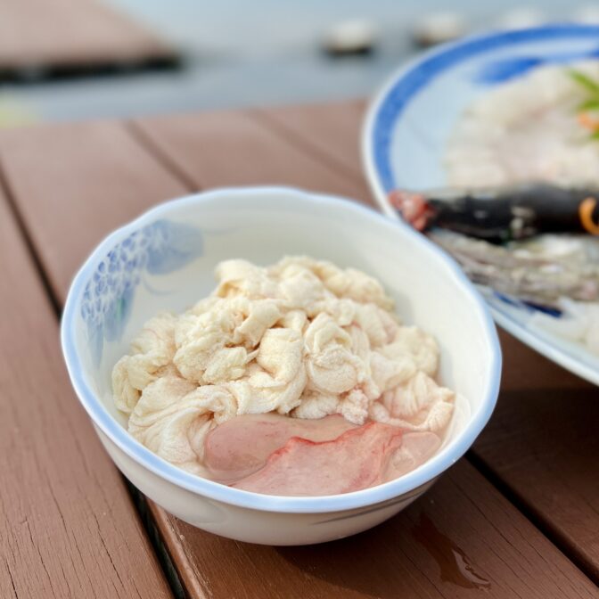 鱧の子と肝は珍しく、臭みも全くない濃厚な味わい。淡路島名物で初夏の味覚として、おすすめする逸品です。