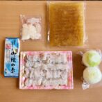 骨切りなどの下処理を行なった身・鱧の子(卵)・鱧の肝・アラと玉ねぎで炊いた特製出汁・淡路島産玉ねぎ・〆の素麺をセットにした、豪華な鱧すきフルセットです。