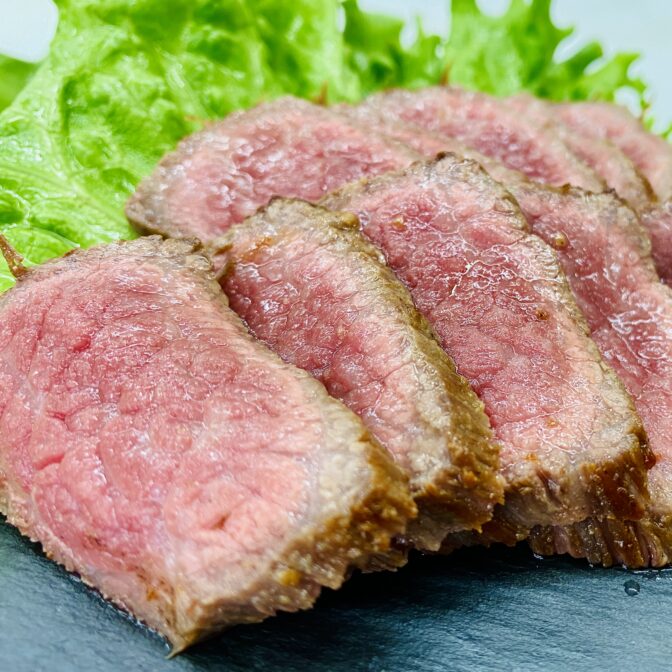◆たたきは赤みの多い外ももを使用し、味付けは塩胡椒・ニンニクのみ。フライパンで一塊ずつ高温で丁寧に焼き上げました。特製ポン酢との相性抜群。冷蔵庫解凍で食べれます。