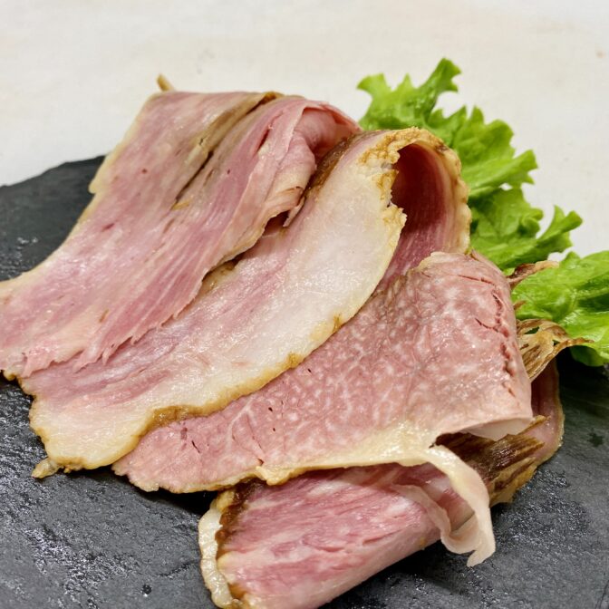 ◆珍しい牛肉のベーコンは、塩漬けし、燻製にしています。神戸ビーフは融点が低いのが特長なので、このベーコンも脂がすぐにトロけます。とっても贅沢な逸品。冷蔵庫解凍で食べれます。
