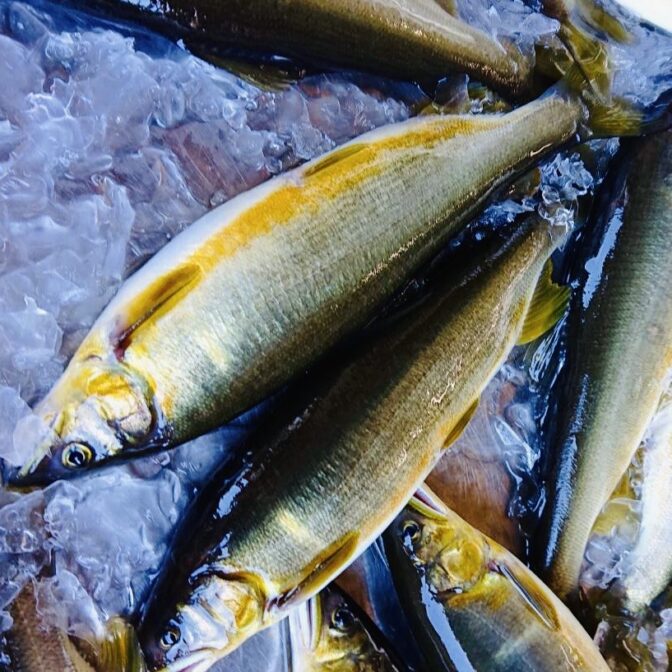 子持ち鮎は、8月下旬から9月いっぱいの短い期間のみで、一般のスーパーなどで出回ることはほとんどありません。びっしりと詰まった卵はこの時期ならでは。