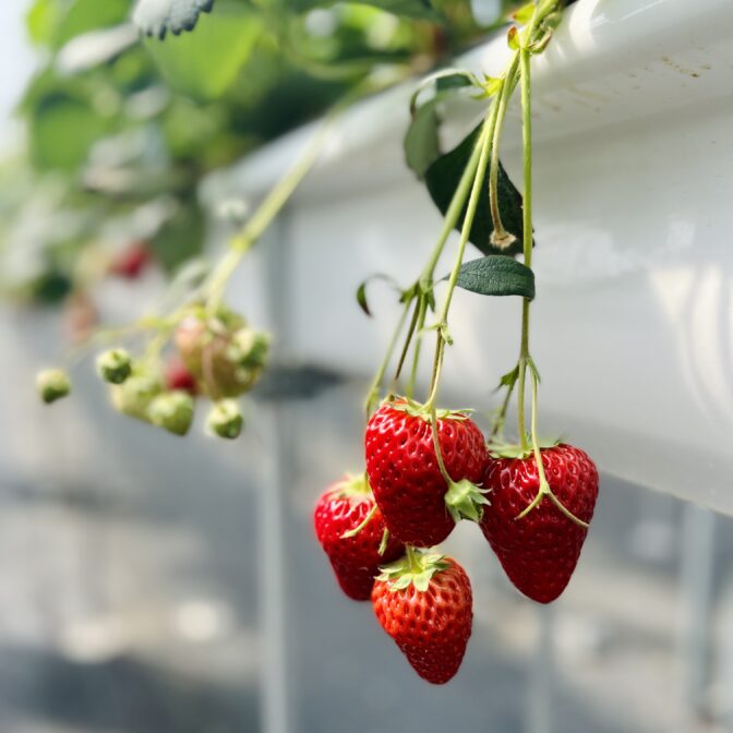 ハウスはとっても綺麗に手入れされており、入った瞬間にいちご特有の華やかな香りに包まれ、幸せな気持ちに。