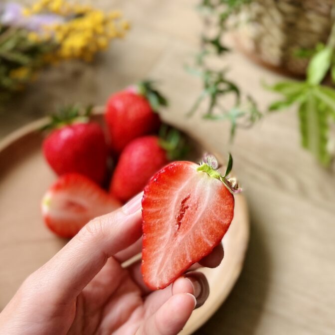いちごは、1株の中で花が咲いた順に大きさが決まります。先に咲いた花ほど大きい実(花托)になる果物です。