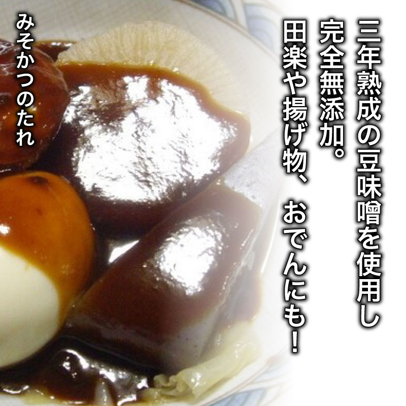 3年熟成の豆味噌を使用し、シンプル原材料にこだわった完全無添加の商品です。味噌カツはもちろん、田楽や揚げ物、おでんなどにもおすすめです!