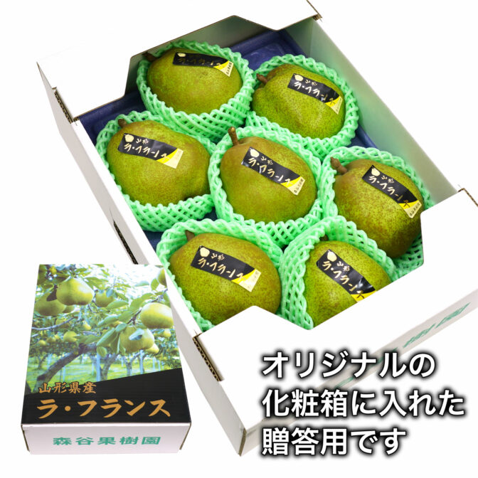 親子3代で果樹園を営まれている、山形市の森谷さんファミリーのラ・フランス(特秀)です。こちらはオリジナル化粧箱に入った贈答用!熨斗も承りますので、ご希望の方は備考欄にご記入ください。