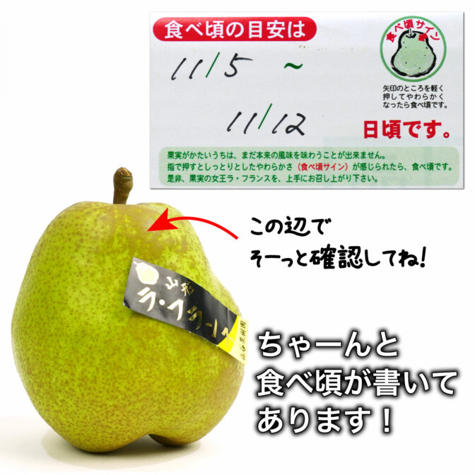 収穫は10月中旬に行われます。実は採れたてはめちゃくちゃ固いし甘くないんですね。冷蔵庫で10日以上寝かせることで、追熟し甘くて美味しいラ・フランスになります。食べ頃は軸がしんなりして、軸の周りが柔らかくなった頃♪(発送される商品ごとに食べ頃時期の目安を明記しています)